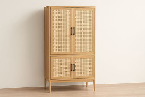 Lit double en bois avec tête de lit en tissu crème et tiroirs -