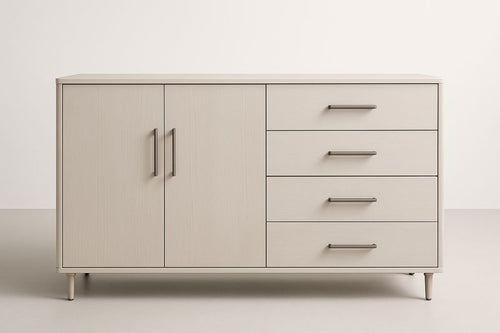 Meuble TV bois MDF et verre blanc avec tiroirs 150x45x50 cm -